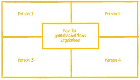 In der Einzelarbeitsphase notiert ihr eure Gedanken, Ideen oder Fragen, die ihr in Bezug auf die Arbeitsfrage habt, in eurem Feld. In der anschließenden Gruppenphase dreht ihr das Blatt immer eine Position weiter, damit alle einmal die Ergebnisse aller anderen Gruppenmitglieder gelesen haben. Nun habt ihr Zeit, eure Ergebnisse zu diskutieren und zu entscheiden, welche Ergebnisse in