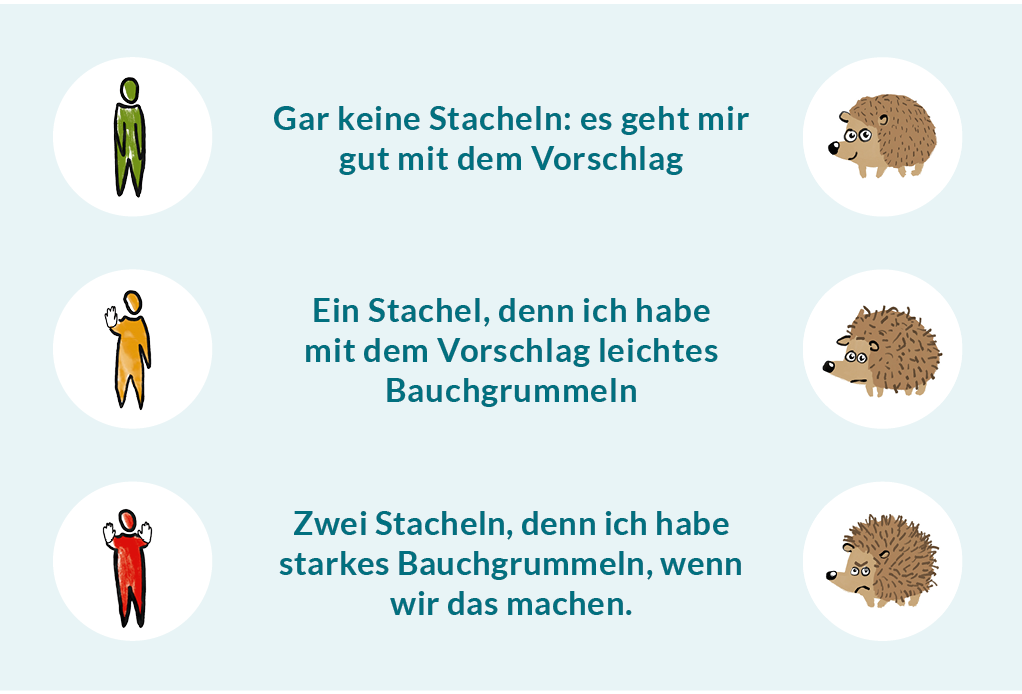 Wir arbeiten hier gerne mit dem Igel. Der stellt seine Stacheln auf, wenn er etwas gar nicht mag oder legt sie an, wenn er sehr einverstanden ist. Der Vorschlag, mit dem es der Igelfamilie am besten geht, wird angenommmen.